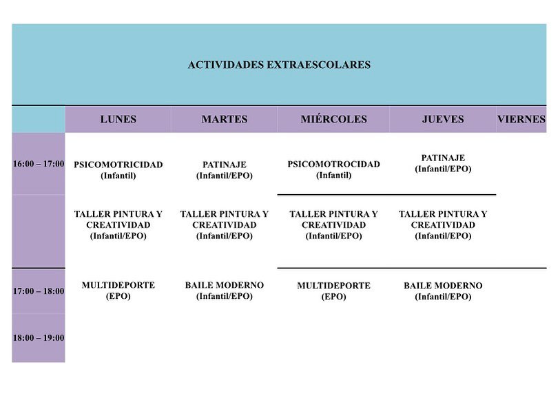 – Actividad extraescolar: 18 €/mes: dos días a la semana. Bonificación AMPA: 3 € menos. Si se encuentran interesados en alguna actividad pregunten en la portería del centro para la formalización de matrícula.