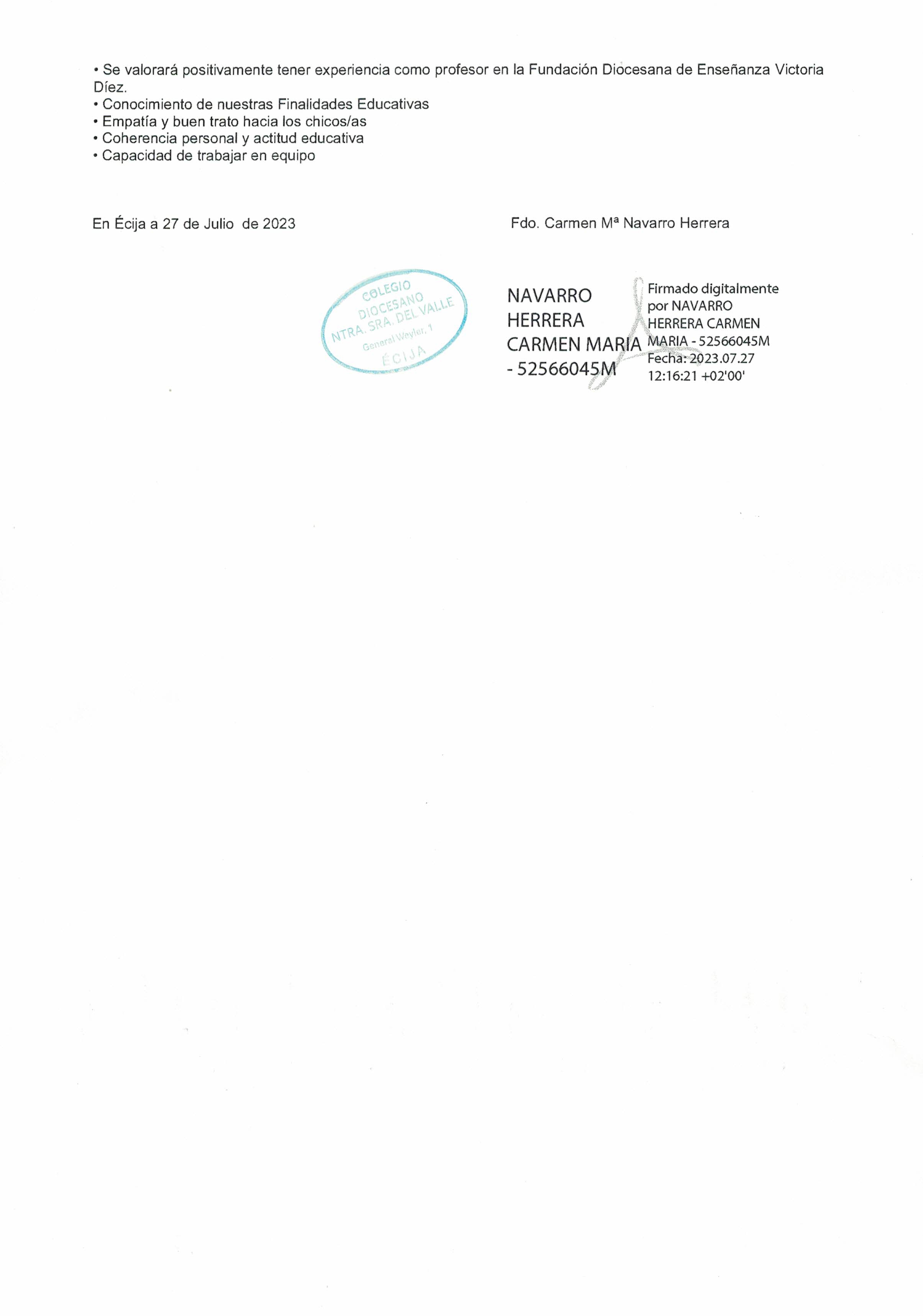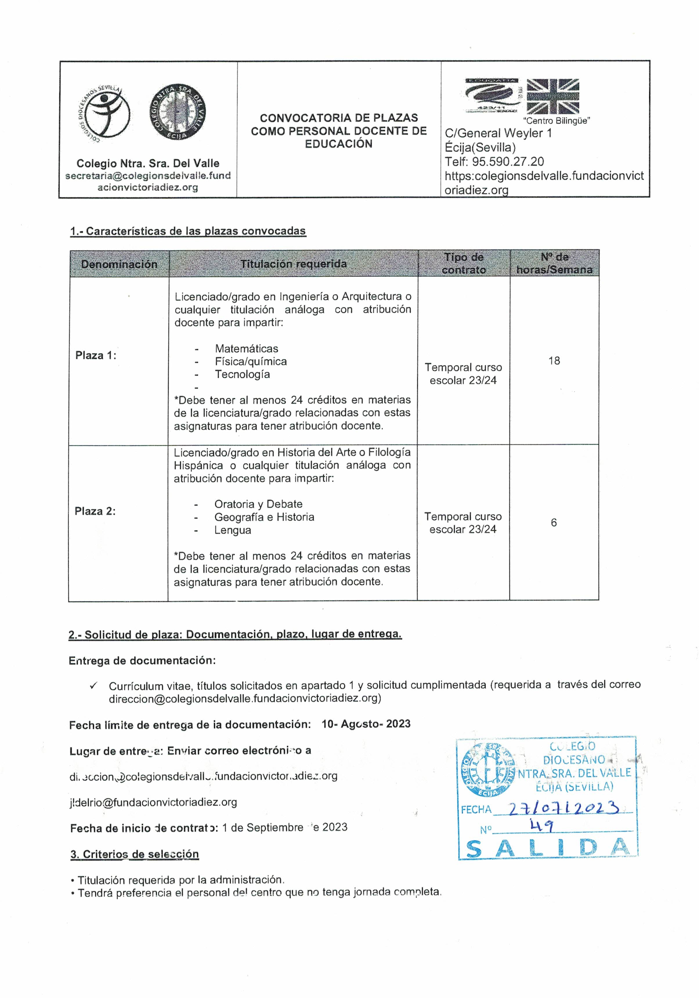 CONVOCATORIA DE PLAZAS DOCENTES -CURSO 23/24-
