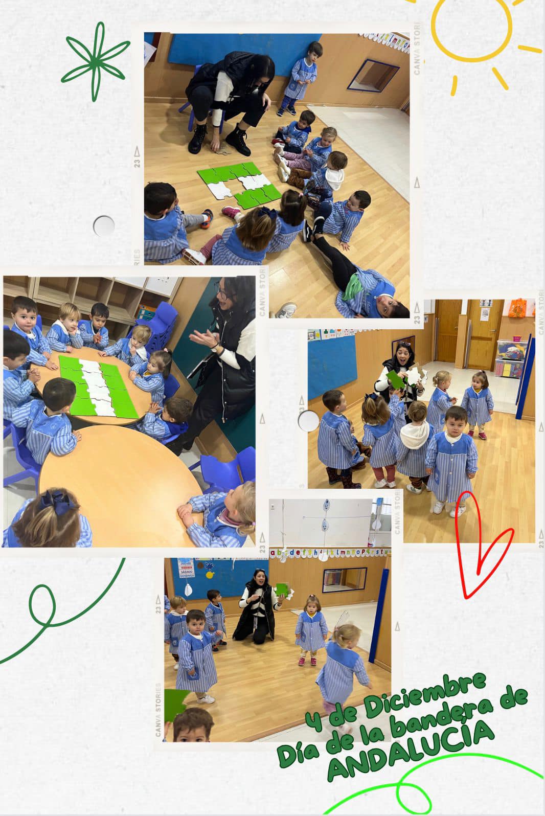 14 diciembre, 2023 Para celebrar el día de la bandera de Andalucía los peques de la escuela Virgen Milagrosa han ido buscando piezas repartidas por el aula con la que hemos formado nuestra bandera a modo de puzzle
